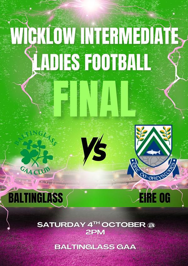 Intermediate Ladies football Final will take place on Saturday the 4th October at 2pm at home in Baltinglass.
