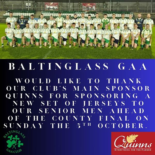 Special thanks to our main sponsors Quinn's for sponsoring a new set of jerseys for our Senior Men ahead of the county final this Sunday vs Carnew.
