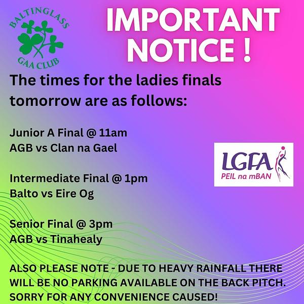 Please see revised times for the LGFA Finals tomorrow in Baltinglass.