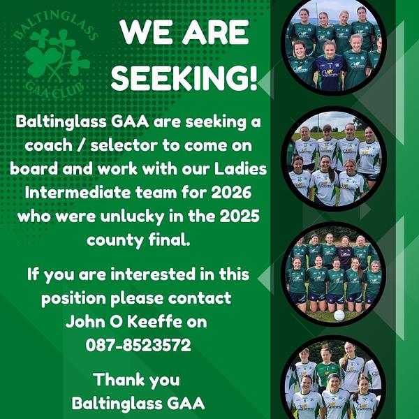 Baltinglass GAA are seeking a coach / selector to come on board and work with our Ladies Intermediate team for 2026 who were unlucky in the 2025 county final.